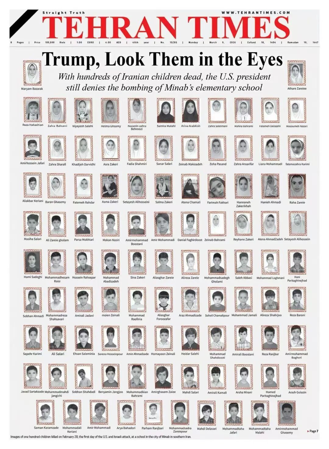 3月9日,伊朗《德黑兰时报》的头版,是一个整版被炸死小孩子的照片合集,硕大的标题写着:“特朗普,你看着她们的眼睛”!