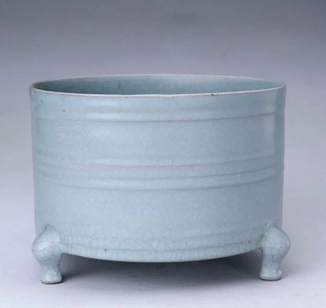 北宋汝窑淡天青釉弦纹三足樽式炉,釉色偏绿,是天青色绿调说的代表,直观呈现汝窑青釉对柴窑的传承与发展。来源/北京故宫博物院